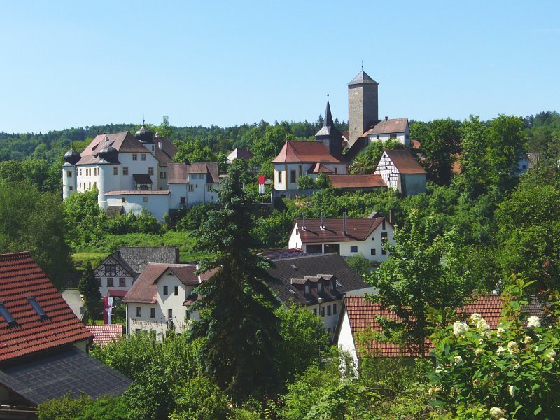 Blick auf Aufseß mit Schloss und darunter Brauerei Rothenbach.